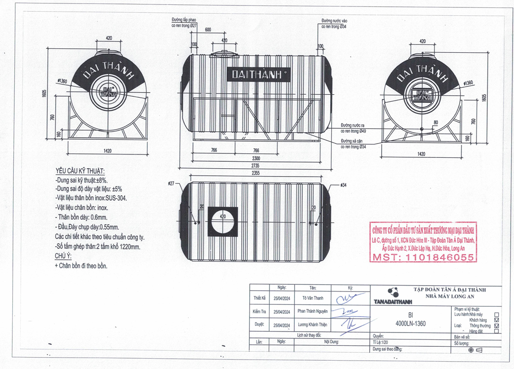 Bồn nước 4000 lít Phù hợp cho gia đình lớn, công trình vừa và lớn như khách sạn, nhà hàng, xí nghiệp cần dự trữ lượng nước lớn đảm bảo an toàn vệ sinh.
